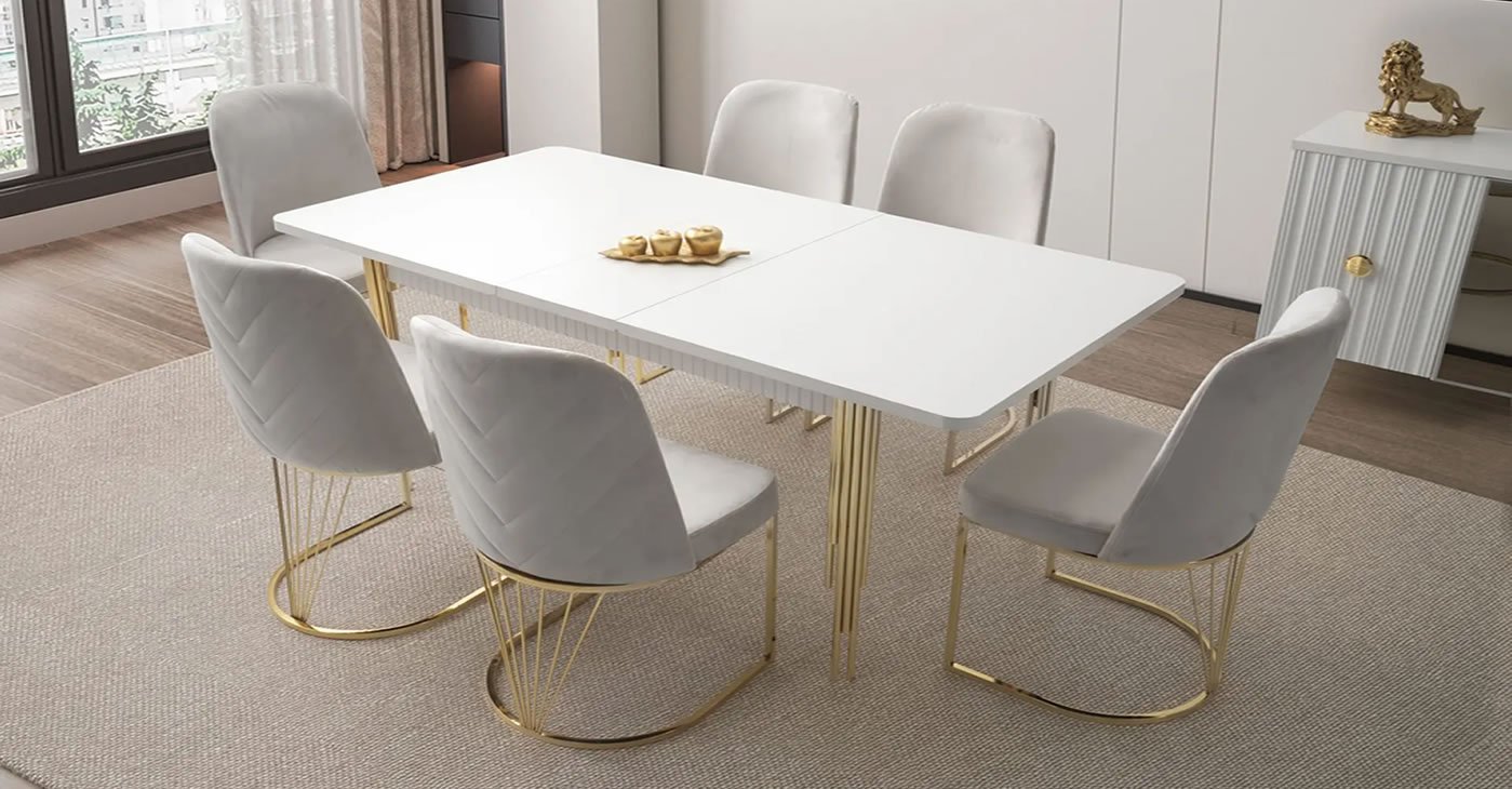 Ürünümüz: Aynasız Konsol, Konsol Aynası, Masa ve 6 Sandalye den takım oluşmaktadır. Ürünlerimizde 1'inci sınıf işçilikle üretilmekte olup MDF dir. Açılır kapanır olma özelliğine sahiptir. Sandalye Adet Fiyatı: 2.850 TL | AÇIK HALİ 180*90 KAPALI HALİ İSE 150*90CM DİR