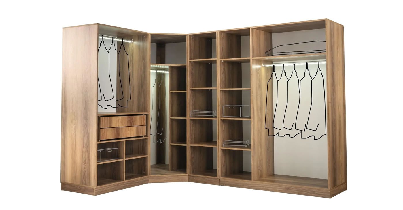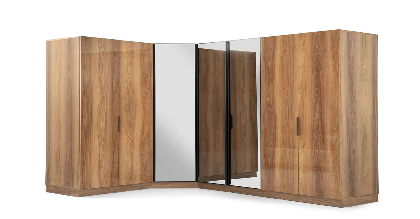 Yatak odası takımımız köşe L gardırop olarak tasarlanmış olup %100 MDF'den üretilmiştir. Bağımsız modüler özelliği ile dolabınızın boyutunu istediğiniz gibi seçebilirsiniz. Modüllerimiz 3 kapaklı dolap + köşe dolap + 2 kapaklı dolap + 1 kapaklı dolap şeklindedir. İsteğe göre modüller eklenebilir veya çıkarılabilir. Yatak odası kapakları membrandır. Dolap kapakları menteşeli frenlidir. Elbise askılarında LED ışıklar bulunmaktadır. Komodin üstündeki panelde ayna ve aplik ışık bulunmaktadır. Dolap aynalı kapaklarında yansıtıcı cam bulunmaktadır.